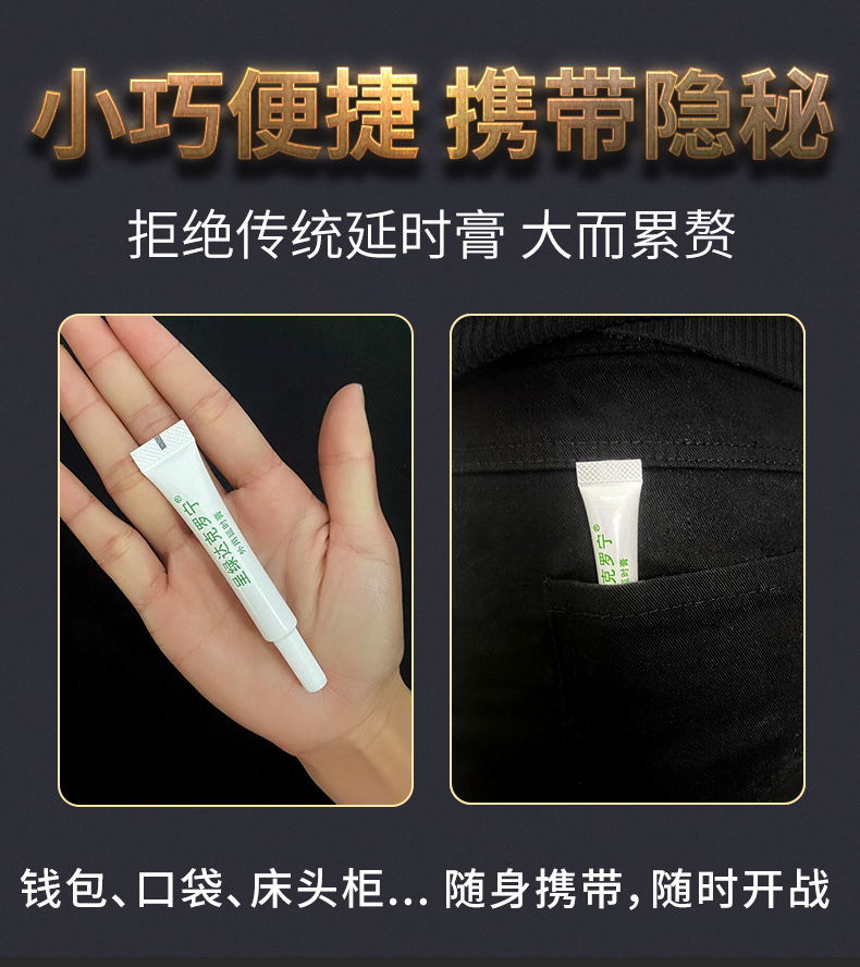 使用方法:房事前40分鐘左右擠出取黃豆粒大小分量均勻塗於陰莖中部,龜頭與冠狀溝部位輕輕按摩,直至膏體看不見。註:避開尿道口塗抹。註意:戴套可以不需要清洗。